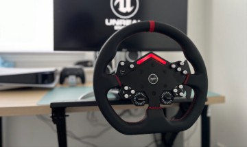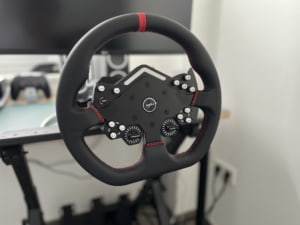 Das Lenkrad wirkt optisch etwas gewöhnungsbedürftig, der Materialmix mit Metall und Kunstleder aber hochwertig. Besonders positiv sticht das massive Quick Release-System heraus, das einem beim Montieren fast schon Angst macht und das Force Feedback perfekt überträgt – schaut genau hin, Fanatec! Der Kranz liegt gut in der Hand, alle Tasten und Shifter sind beim Fahren gut zu erreichen. Die Tasten sind, warum auch immer, zu lang geraten und haben deshalb zu viel Spiel. Die Shifter fühlen sich gut an, sind aber ohne mitgelieferte Schalldichtung zum Kleben etwas laut.
